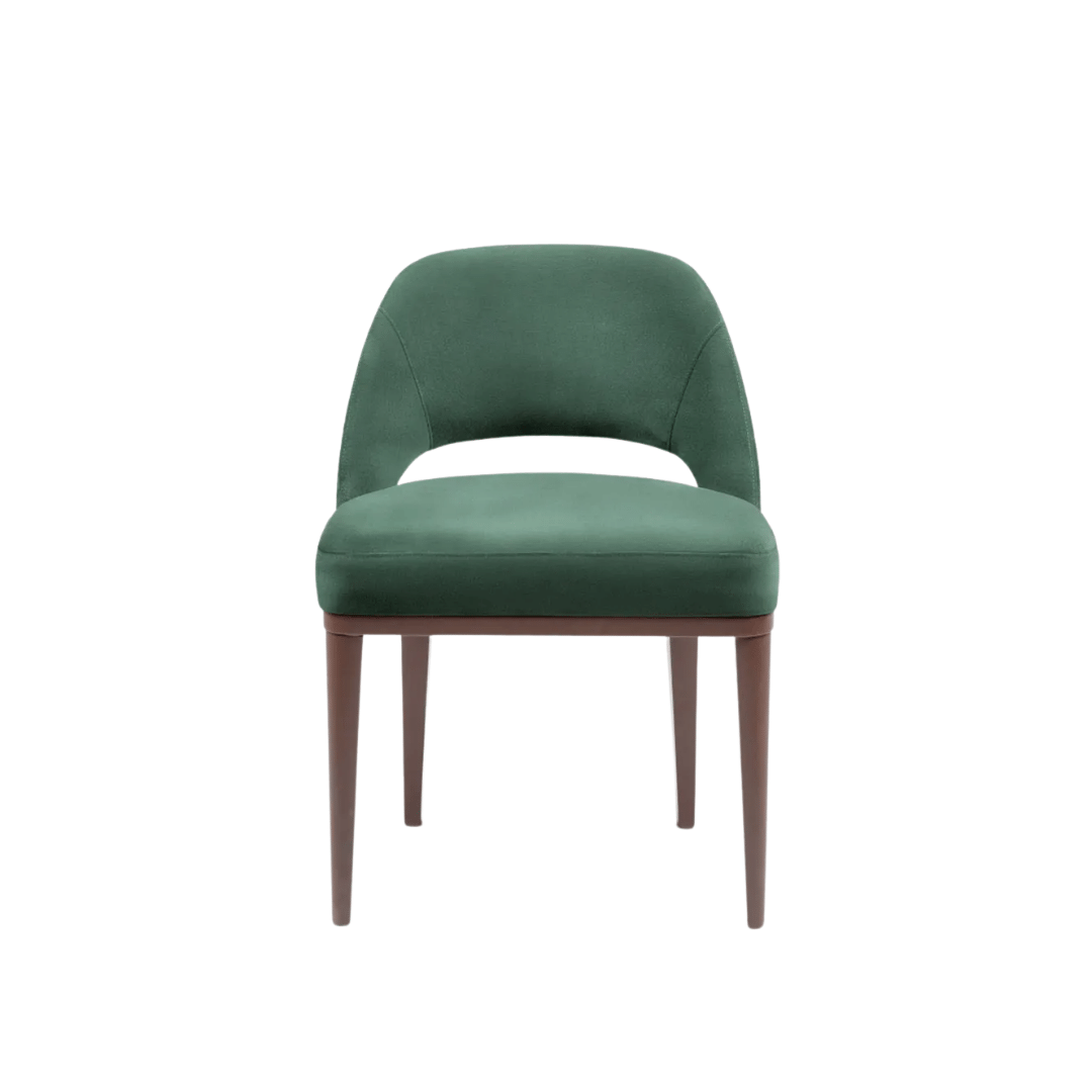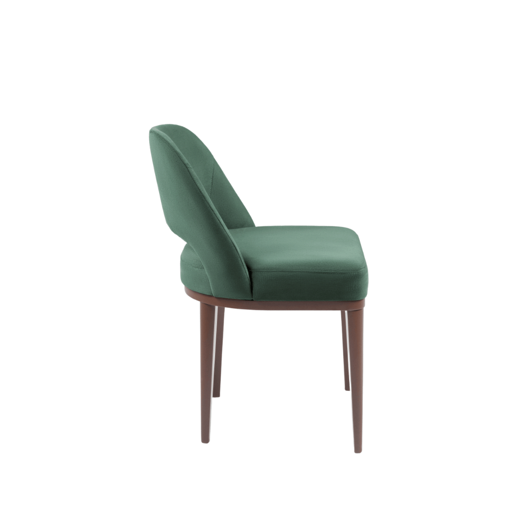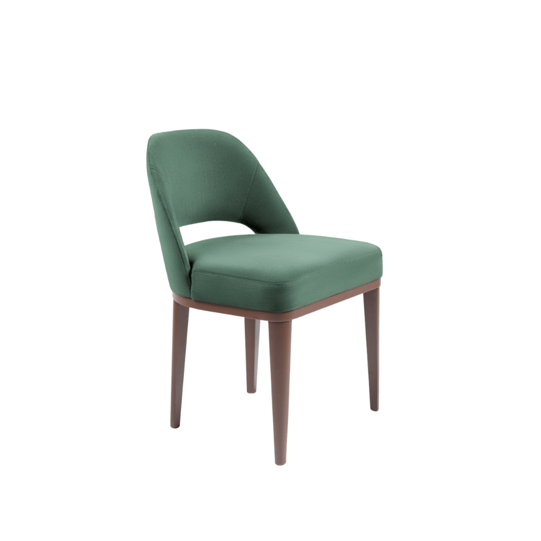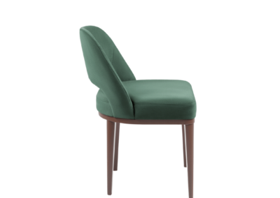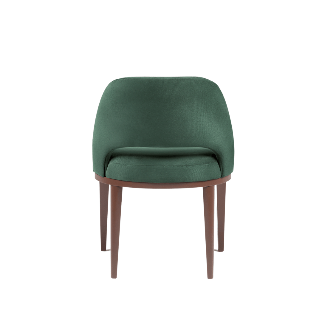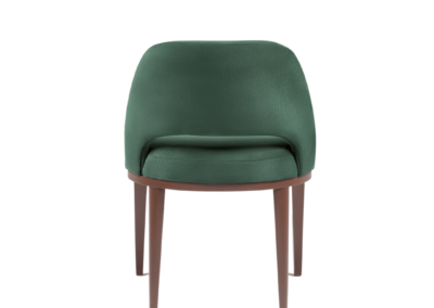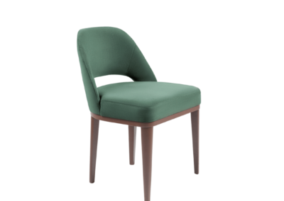 Assento fixo com almofada costurada em pesponto simples. Encosto fixo com costura em pesponto simples. Base em madeira no acabamento pintura verniz.